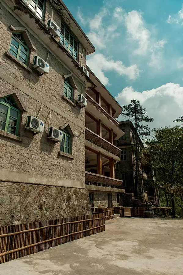 从大堂走向通往院内的石阶,建筑整体依山势而建,使得建筑与周遭的环境融合为一体。这在山中是少见的。