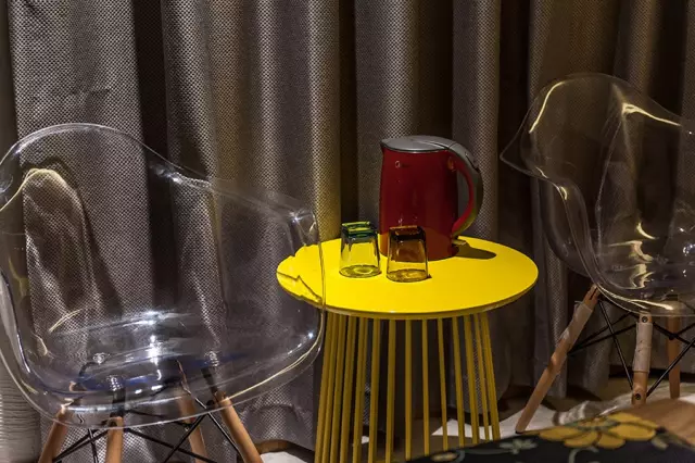 西苑设计手法为新中式,或原木风格的别致,或大红色座椅的雍容。